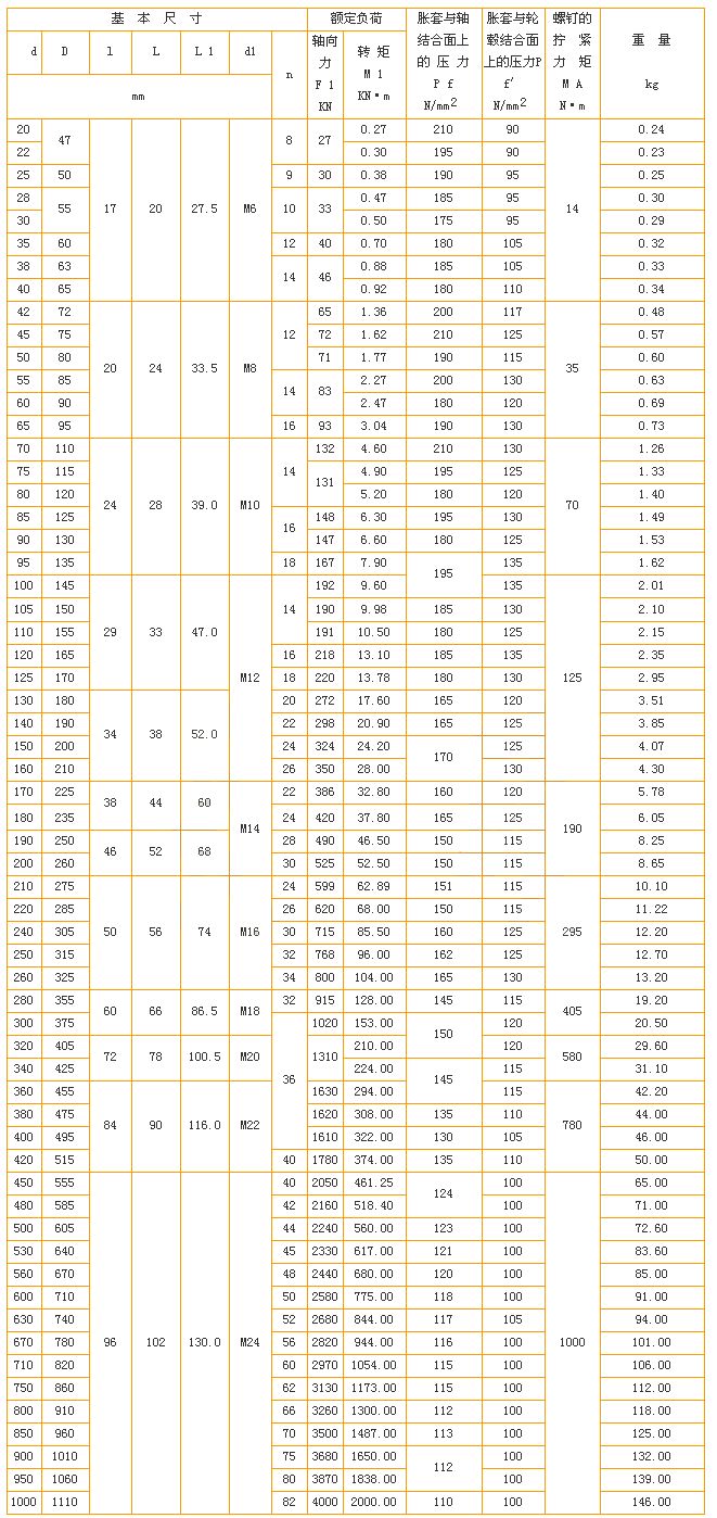 特性:Z2型脹緊套由一個開口的雙錐內環,一個開口的雙錐外環和兩個雙錐壓緊環組成。用內六角螺栓擰緊,擰緊時彈性環沒有相對于軸轂的軸向移動,與Z1型比較,同樣壓緊力能產生 大的徑向壓力,傳遞 大的載荷。為便于拆卸,在一個壓緊環上有拆卸用螺孔,沿圓周共有2~4處。鎖緊聯結盤廣泛應用于包裝、印刷、紡織、機床等機械上。